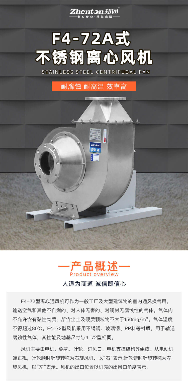 不得超過(guò)80°C。F4-72型風(fēng)機(jī)采用不銹鋼、玻璃鋼、PP料等材質(zhì),用于輸送