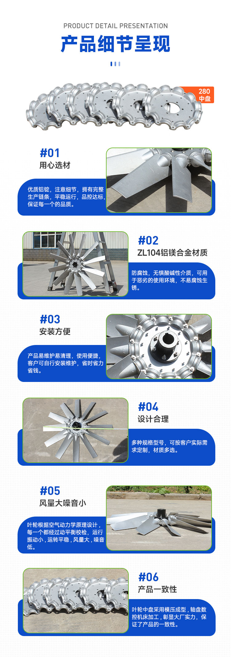 新款鋁鎂合金機(jī)翼型軸流風(fēng)葉12葉,由鄭通風(fēng)機(jī)制造有限公司生產(chǎn)。 葉片比普通鋁合金軸流風(fēng)葉的葉片要大。 主要針對(duì)風(fēng)量、風(fēng)壓有特定需求的風(fēng)機(jī)。 葉片采用變截面空間扭曲機(jī)翼型葉片技術(shù),使用壽命長(zhǎng),不易截?cái)?,效能轉(zhuǎn)換高,有效降低風(fēng)葉轉(zhuǎn)動(dòng)的噪音。 輪殼采用無(wú)道風(fēng)對(duì)夾式技術(shù),可減少安裝空間,安裝更方便。 葉片采用鋁合金鑄造,減輕風(fēng)葉的重量。 葉片由對(duì)夾式輪殼定位,增加葉片的強(qiáng)度,運(yùn)行更穩(wěn)定。 葉片安裝角度可按用戶(hù)對(duì)風(fēng)量風(fēng)壓的需求進(jìn)行調(diào)整, 可以調(diào)整到使葉片產(chǎn)生正向流動(dòng),實(shí)現(xiàn)正向通風(fēng)的需要。 也可以調(diào)