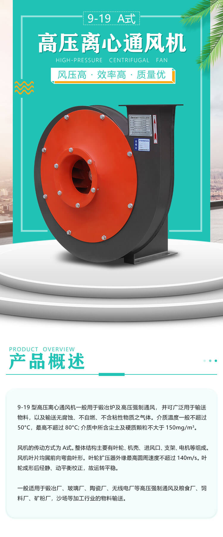 9-19型風(fēng)機(jī)屬于小流量、高風(fēng)壓,效率高、結(jié)構(gòu)緊湊,運(yùn)行可靠等優(yōu)點(diǎn)。