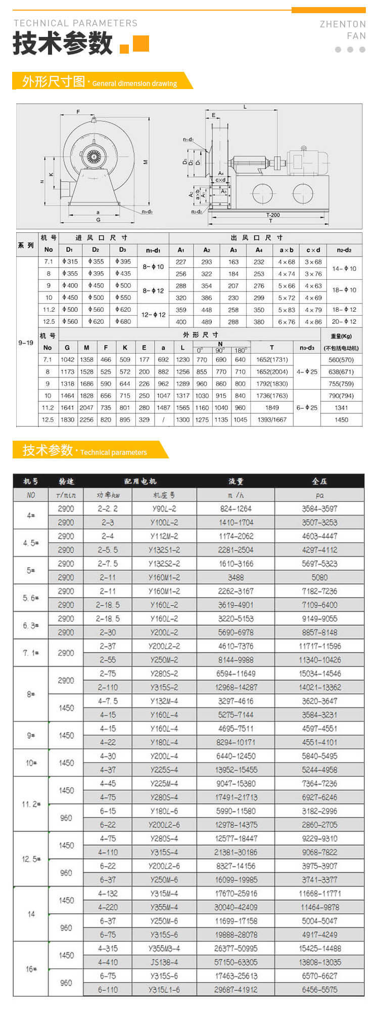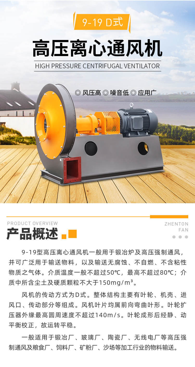 9-19型高壓離心通風(fēng)機一般用于 鍛冶爐及高壓強制通風(fēng), 并可廣泛用于輸送物料,以及輸送無腐蝕、不自燃、不含粘性 物質(zhì)之氣體。介質(zhì)溫度一般不超過50°C,最高不超過80°C;介 質(zhì)中所含塵土及硬質(zhì)顆粒不大于150mg/m 。