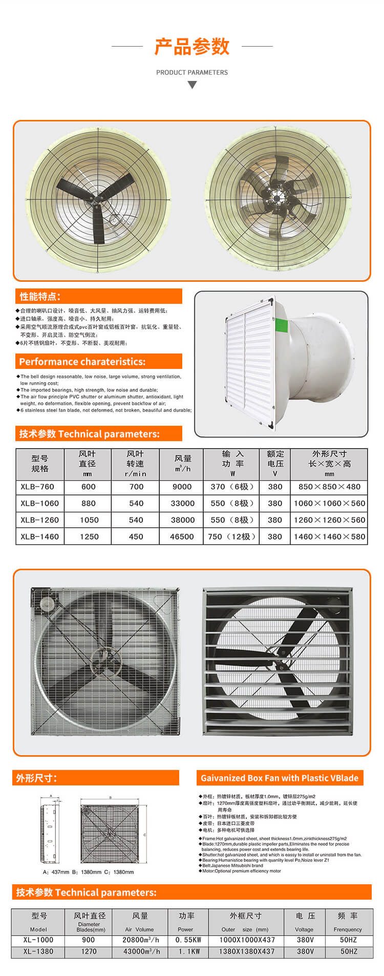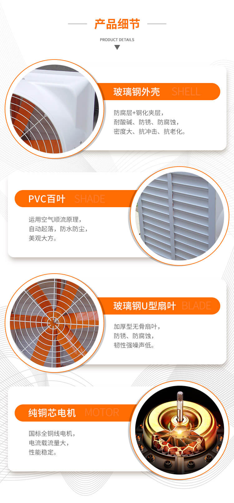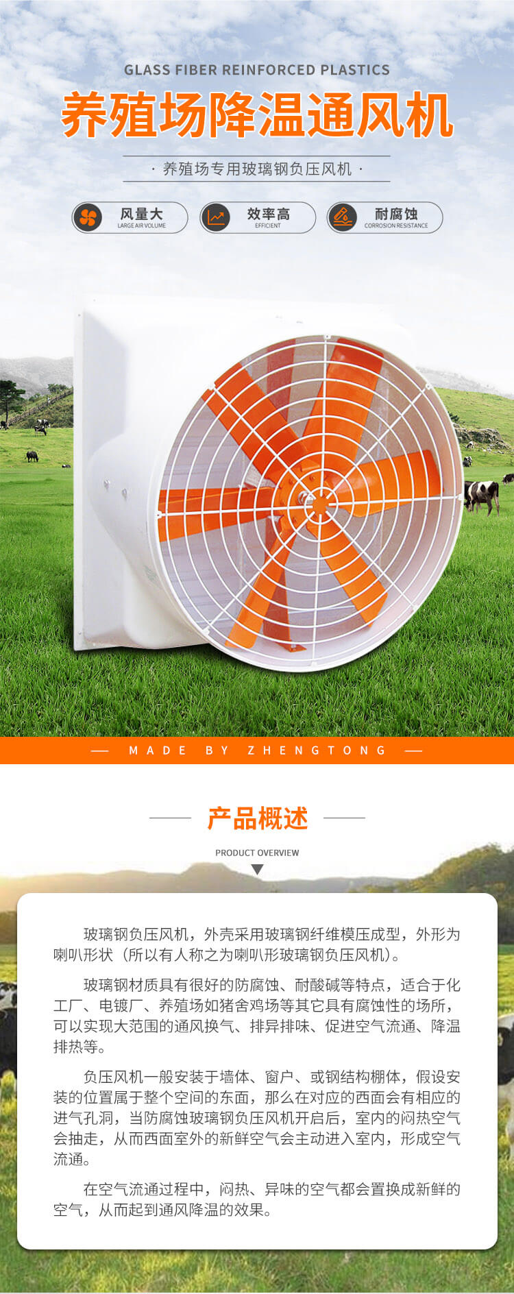 玻璃鋼材質(zhì)具有很好的防腐蝕、耐酸堿等特點(diǎn),適合于化工廠、電鍍廠、養(yǎng)殖場如豬舍雞場等其它具有腐蝕性的場所,可以實(shí)現(xiàn)大范圍的通風(fēng)換氣、排異排味、促進(jìn)空氣流通、降溫排熱等。