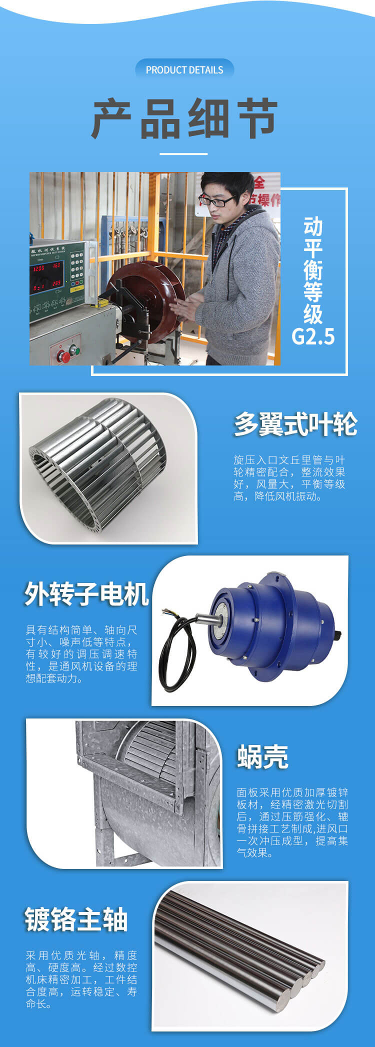 外轉(zhuǎn)子電機直聯(lián)雙進(jìn)風(fēng)通風(fēng)機,前傾多翼葉輪、低噪音。