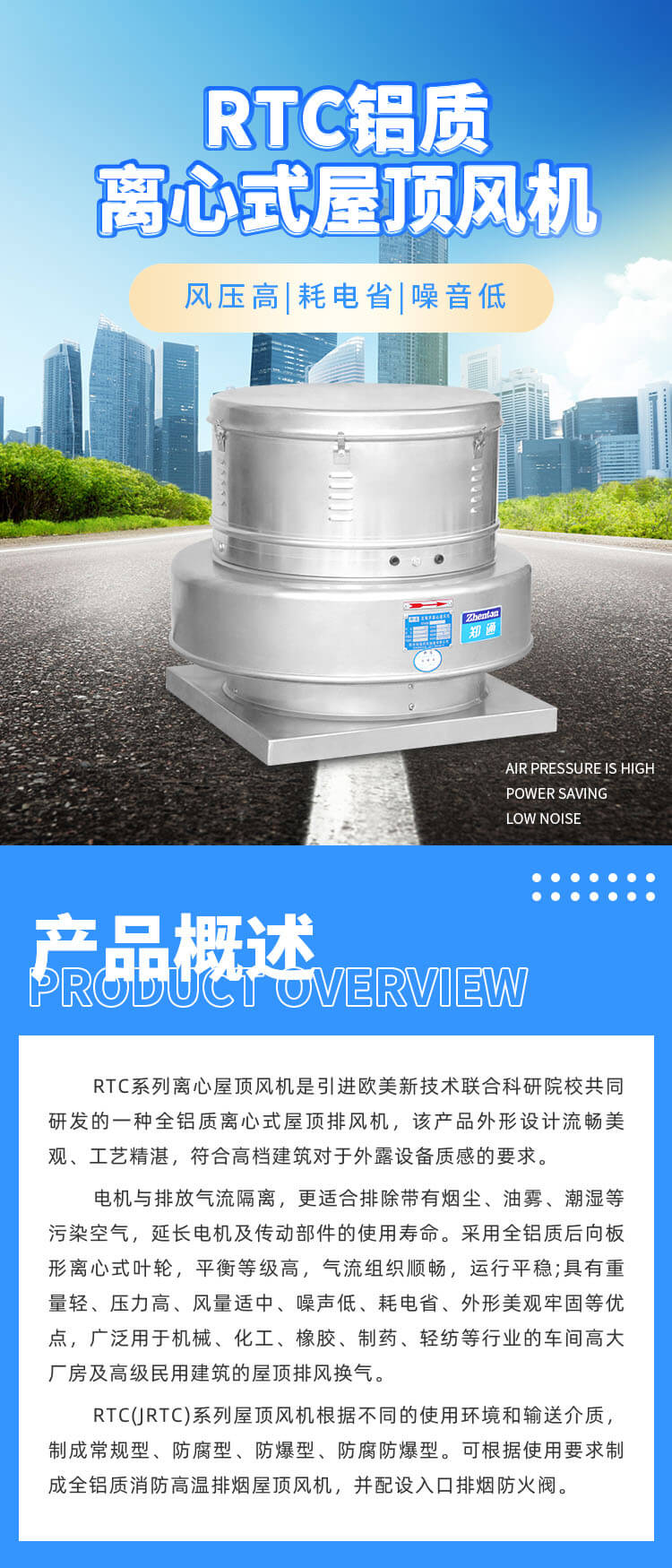 RTC系列離心屋頂風(fēng)機(jī)是引|進(jìn)歐美先進(jìn)技術(shù)聯(lián)合科研院校共同研發(fā)的一種全鋁質(zhì)離心式屋頂排風(fēng)機(jī),該產(chǎn)品外形設(shè)計(jì)流暢美觀,工藝精湛,符合高檔建筑對(duì)于外露設(shè)備質(zhì)感的要求。