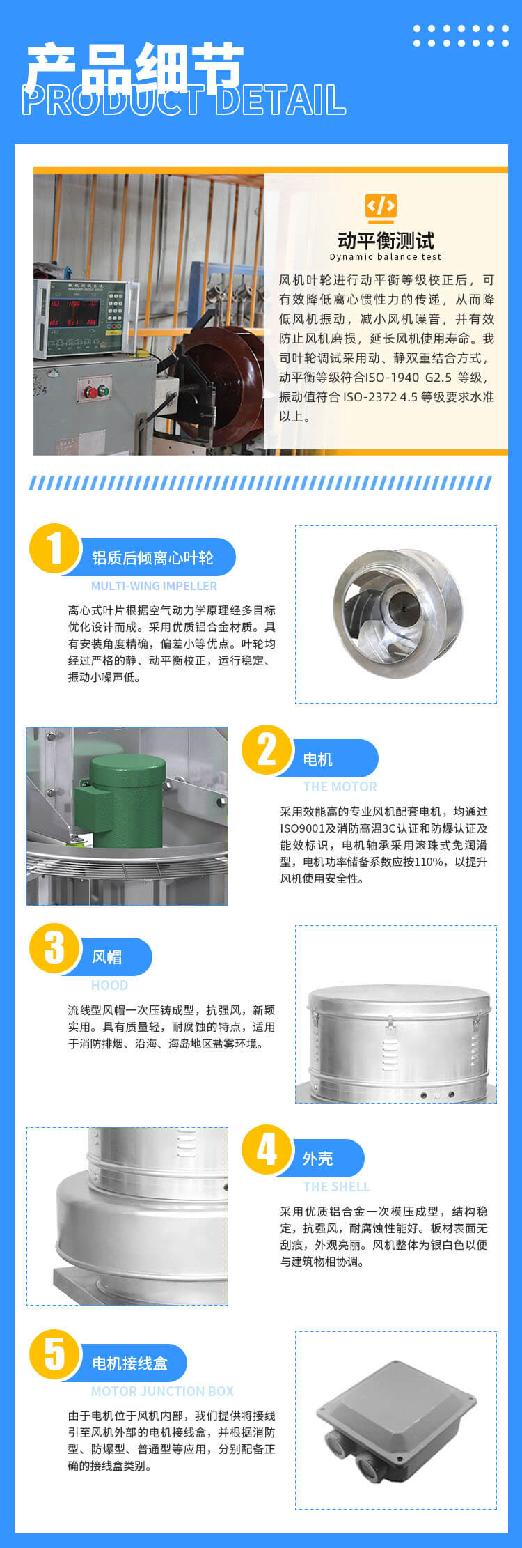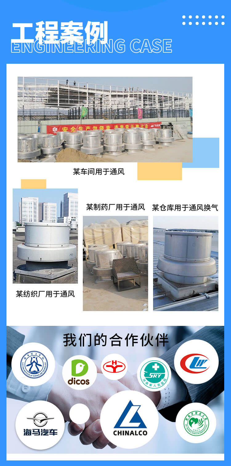 電機(jī)與排放氣流隔離,更適合排除帶有煙塵、油霧、潮濕等污染空氣,延長(zhǎng)電機(jī)及傳動(dòng)部件的使用壽命。采用全鋁質(zhì)后向板形離心式葉輪,平衡等級(jí)高,氣流組織順暢,運(yùn)行平穩(wěn);具有重量輕、壓力高、風(fēng)量適中、噪聲低、耗電省、外形美觀牢固等優(yōu)點(diǎn),廣泛用于機(jī)械、化工、橡膠、制藥、輕紡等行業(yè)的車(chē)間高大廠房及高級(jí)民用建筑的屋頂排風(fēng)換氣。