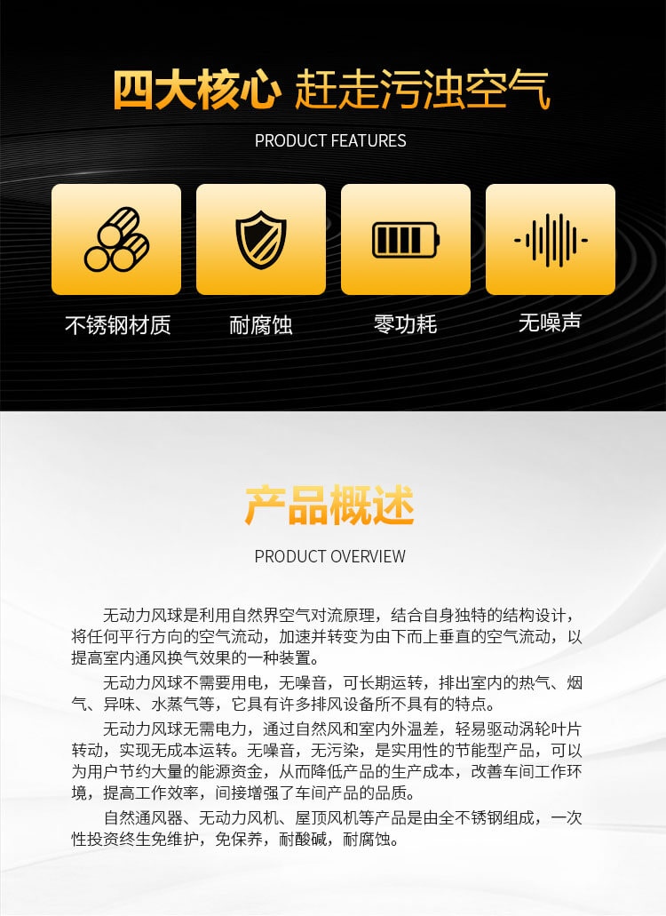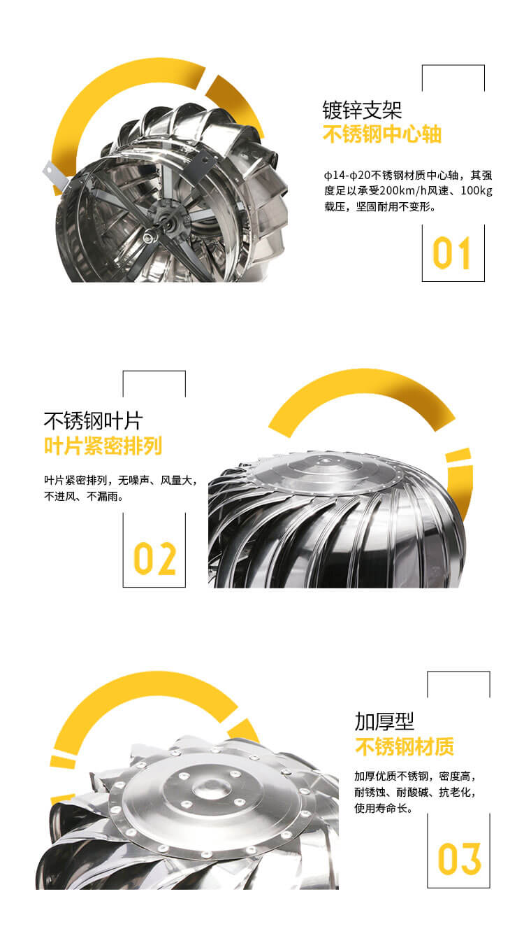 不銹鋼無動(dòng)力風(fēng)球是利用自然風(fēng)力或室內(nèi)外溫差是指運(yùn)轉(zhuǎn),能將廠房車間內(nèi)的熱氣、廢氣、油煙、粉塵等有害氣體排出,表面經(jīng)電化處理,耐氧化,耐腐蝕,使用壽命長,免電力、免維修、無噪聲、堅(jiān)固耐用,防結(jié)露、防雨水。