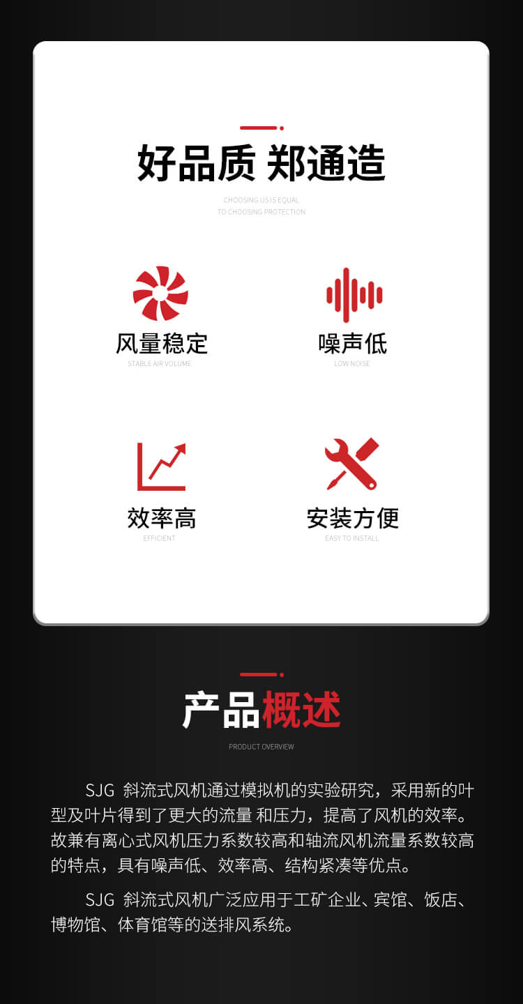 SJG斜流風(fēng)機(jī)廣泛應(yīng)用于工業(yè)及民用建筑等各種通風(fēng)換氣場所,特別使用于通風(fēng)與空調(diào)管道的加壓、送風(fēng)和排風(fēng)