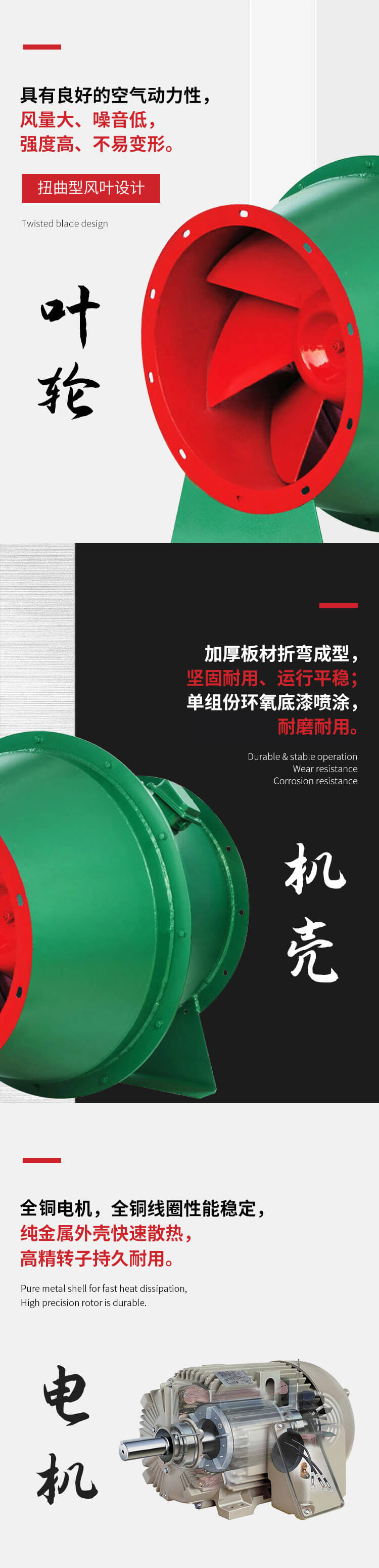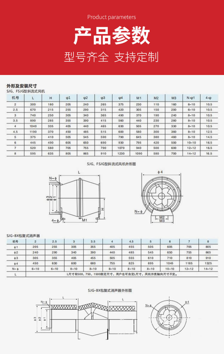SJG斜流風(fēng)機(jī)應(yīng)用斜流子午加速設(shè)計方法,兼有離心式風(fēng)機(jī)壓力系數(shù)較高 和軸流式風(fēng)機(jī)流量系數(shù)較大的特點,具有噪聲低、耗電省、結(jié)構(gòu)緊湊等優(yōu)點