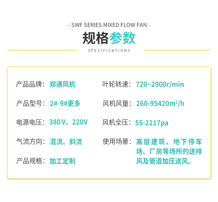 SWF型混流風(fēng)機(jī)多用于冷凍、空調(diào)、紡織、船舶、民用建筑等空調(diào)工程通風(fēng)換氣,普通材質(zhì)風(fēng)機(jī)可輸送空氣和腐蝕性、不自燃的氣體。